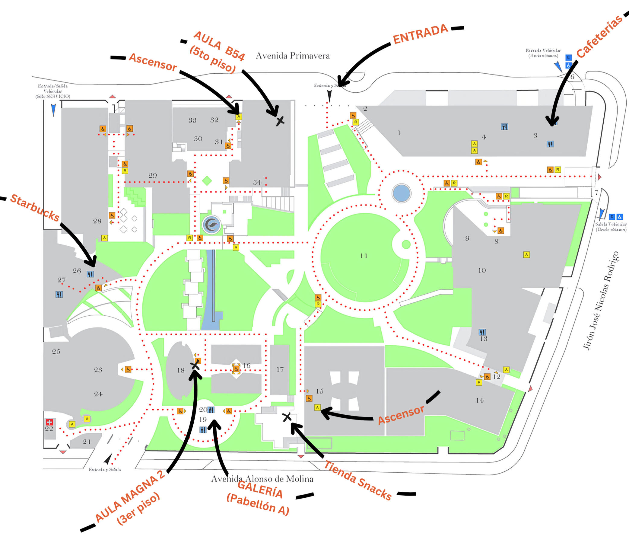 La entrada principal al Campus Monterrico es por la Avenida Prolongación Primavera.El Aula Magna 2 y el aula B54 se encuentran en un 3er y 5to piso respectivamente. Las personas con sillas de ruedas podrán acceder a ellas mediante los ascensores indicados en el mapa.
